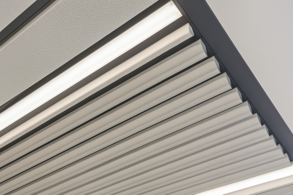 The Baden Combination System features modular geometric panels designed to create vivid linear effects. By combining multiple module sizes, architects can achieve dynamic and personalized ceiling layouts with acoustic options.